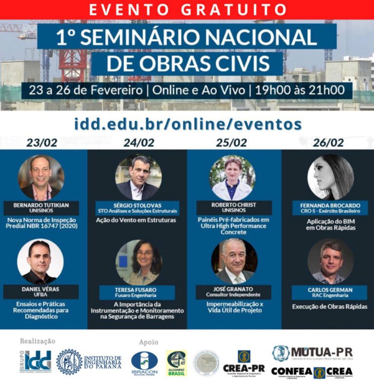 O IEP – Instituto de Engenharia do Paraná, por meio de sua Diretoria Técnica, em parceria com o Grupo IDD, realizarão nos dias 23, 24, 25 e 26 de fevereiro o 1º Seminário Nacional de Obras Civis. O evento conta com o apoio das instituições: IBRACON, ALCONPAT Brasil, ABPE, CONFEA-CREA, CREA-PR e MUTUA-PR O Seminário contará com...